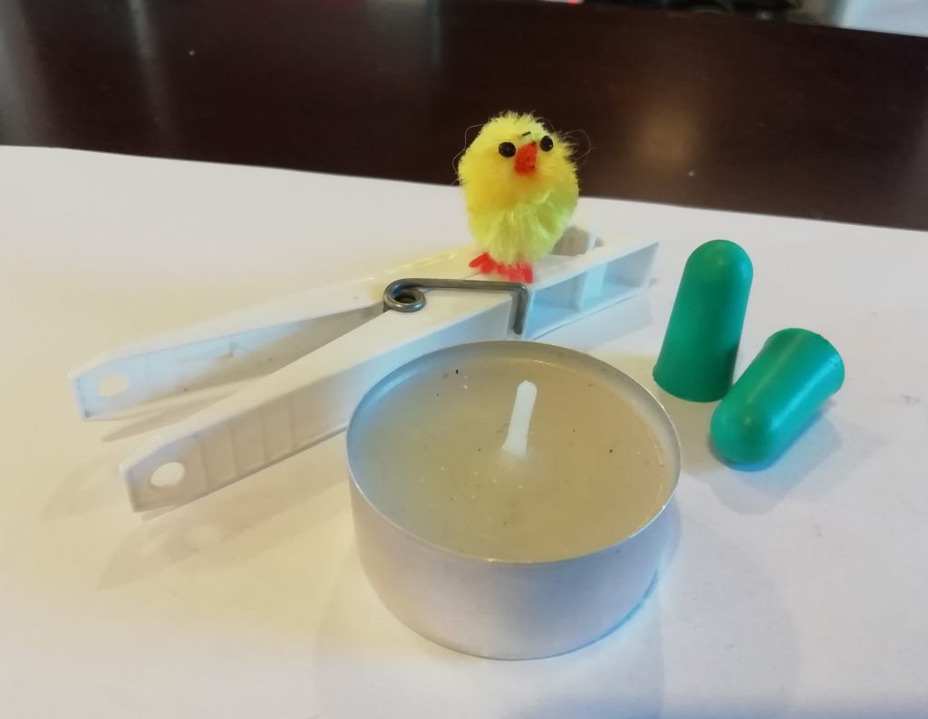 Tavaroiden piirtämistä helpottaa, kun katsot mihin kohtaan mikäkin osa osuu, esim. tässä sommitelmassa kynttilän sydänlanka osuu pyykkipojan jousen keskelle, korvatulpat taas ovat pyykkipojan päädyn päällä.