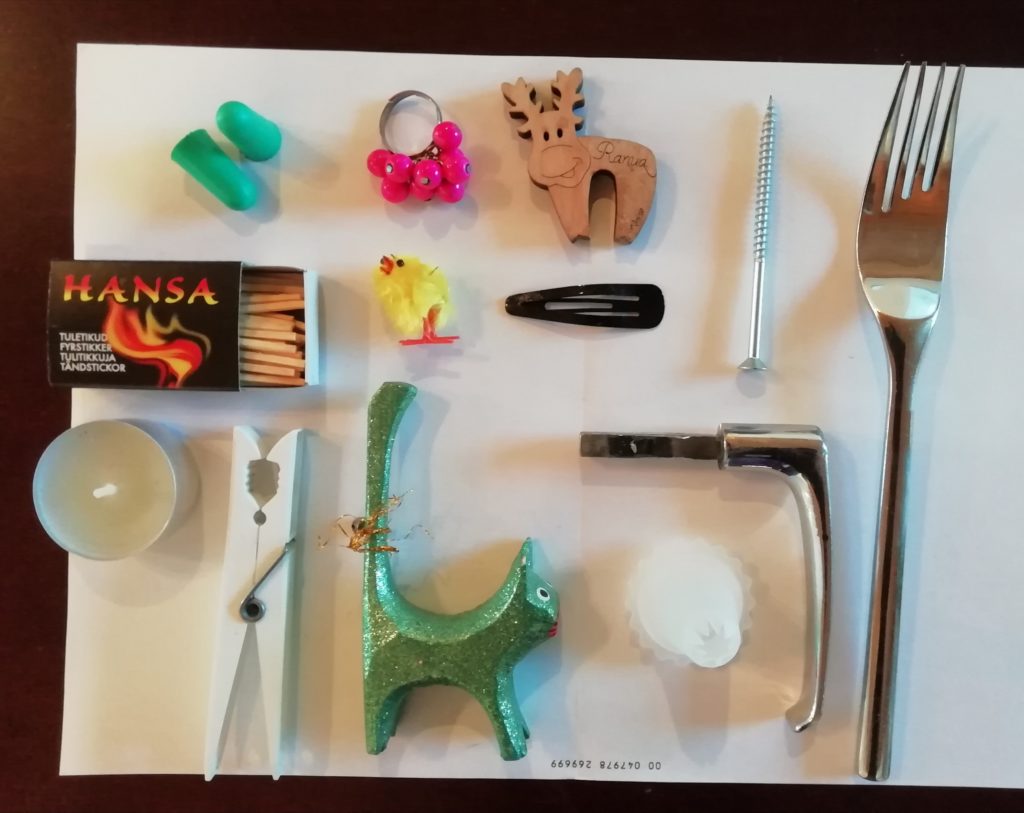 Levitä tavarat pöydälle ja tarkastele niitä. Mikä esine on kiinnostava, mikä sopii yhteen toisen kanssa? Onko tavaroilla jokin yhteinen teema; väri, materiaali, käyttötarkoitus? Ota 3-4 tavaraa, jotka mielestäsi ovat kiinnostavia ja asettele ne esille haluamallasi tavalla.