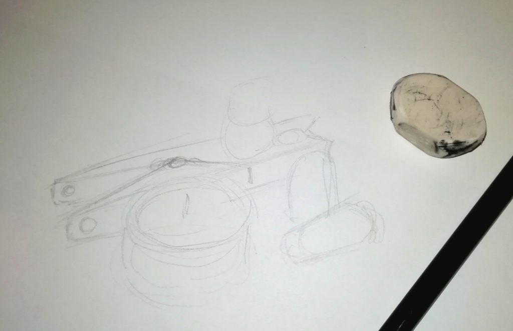 Ota A4-paperi + lyijykynä ja käy hommiin. Luonnostele ensin summittainen näkymä asetelmasta, muista hyödyntää perusmuotoja.