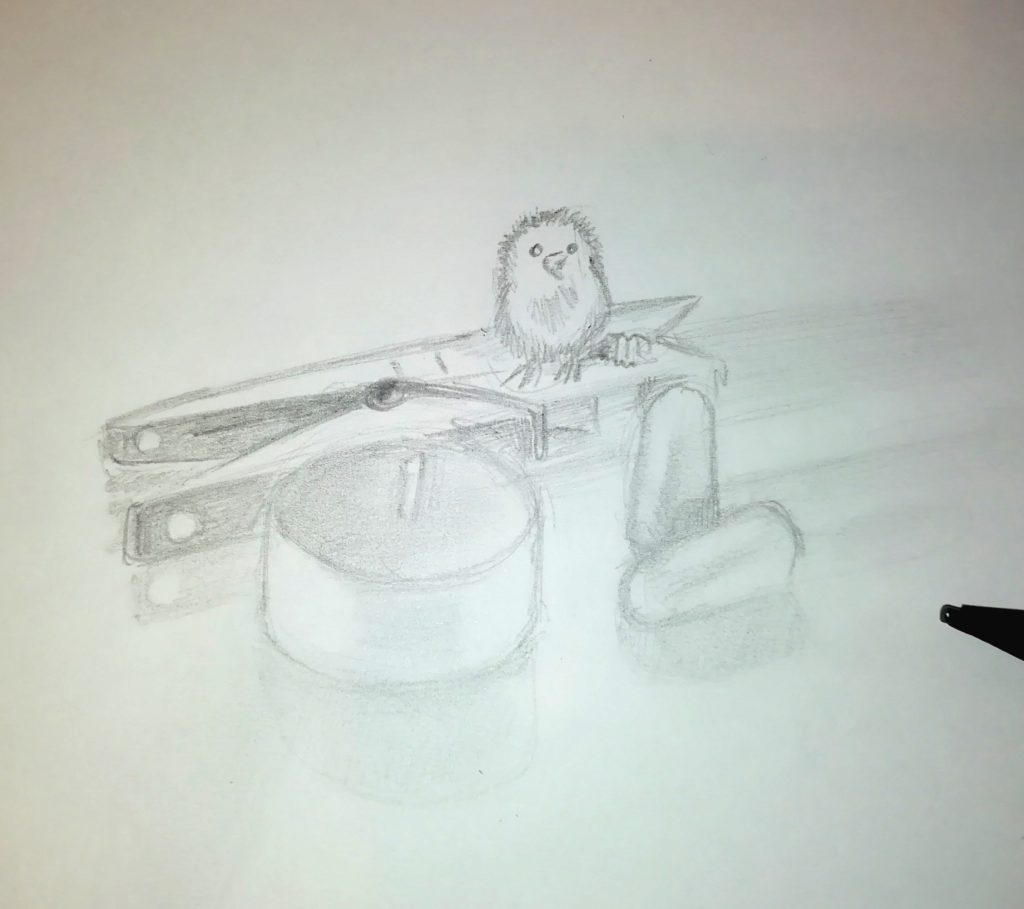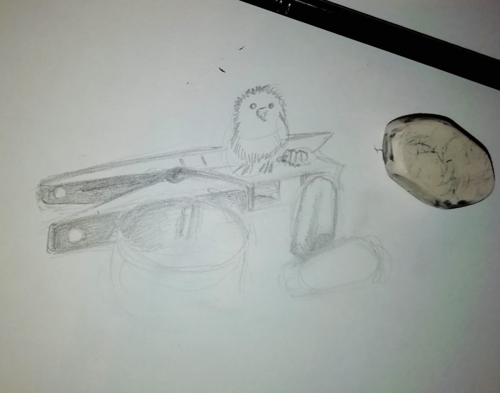 Tämä tehtävä ei ole helpoimmasta päästä, mutta piirtäjänä kehittyy, kun uskaltautuu tekemään hankalampiakin juttuja! Tarvitset paperia ja lyijykynän ja esineitä malliksi. Etsi siis taskun, laatikon tai laukun pohjalta kasa pikkuruista sälää. Tähän työhön käyvät kaikki ne kummalliset pikkutavarat, joille ei ole paikkaa, mutta joita ei halua hävittääkään. Pariton korvakoru, vähän rikkinäinen hiuskoriste, outo ruuvi? Täydellisiä tähän hommaan!