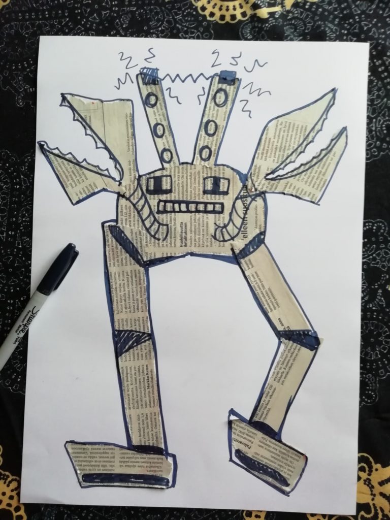 Anna kuivua hetki ja kaiva esiin yksi tai useampi tussi. Nyt voit lisätä robottiin yksityiskohtia; muttereita, ruuveja, valoja, johtoja, antenneja… Mitä sitten keksitkin.