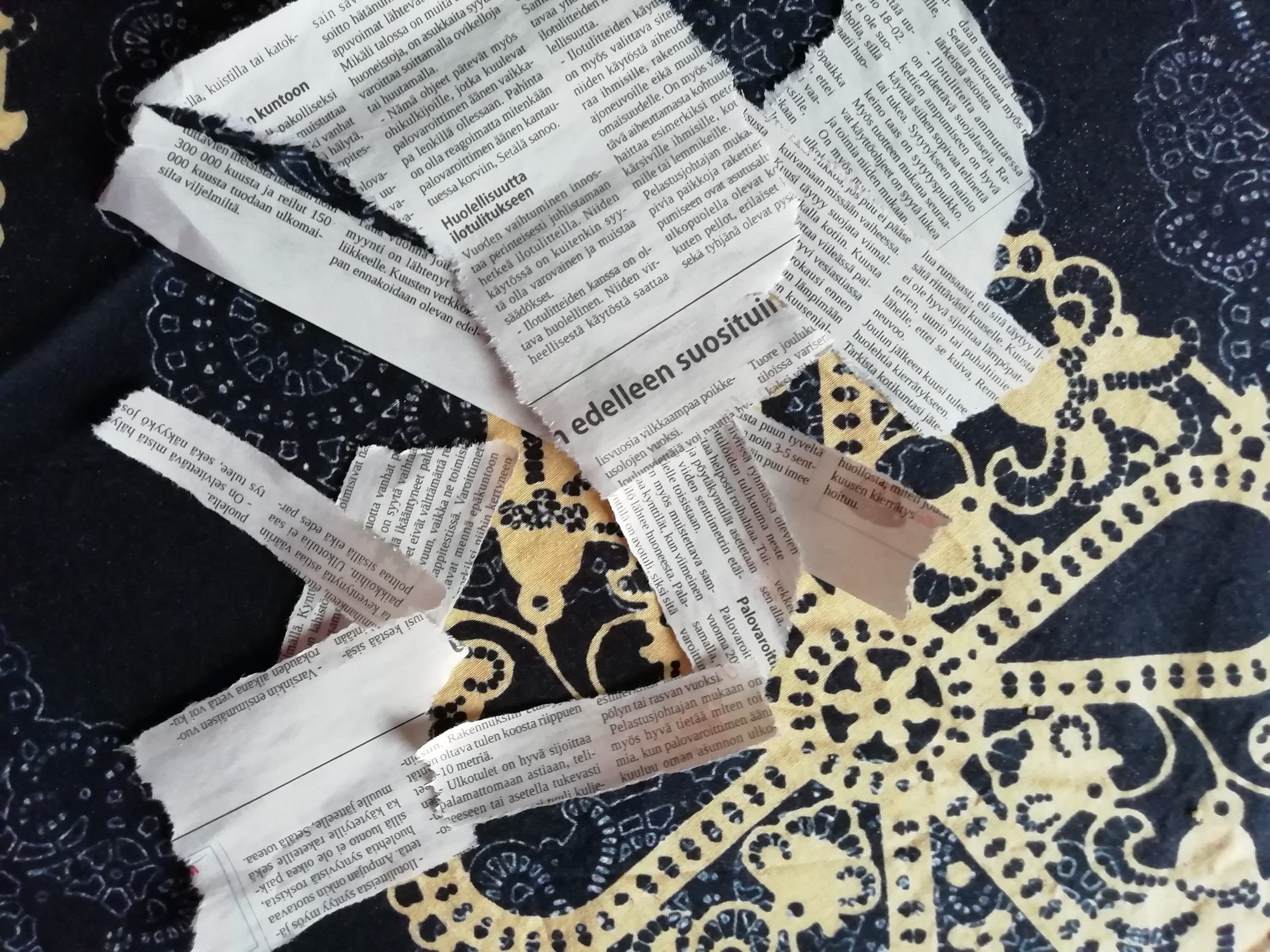 Aloita repimällä sanomalehdestä sopivan kokoisia palasia. Palat voivat olla pitkiä, ohuita, leveitä tai vaikka pyöreitä.