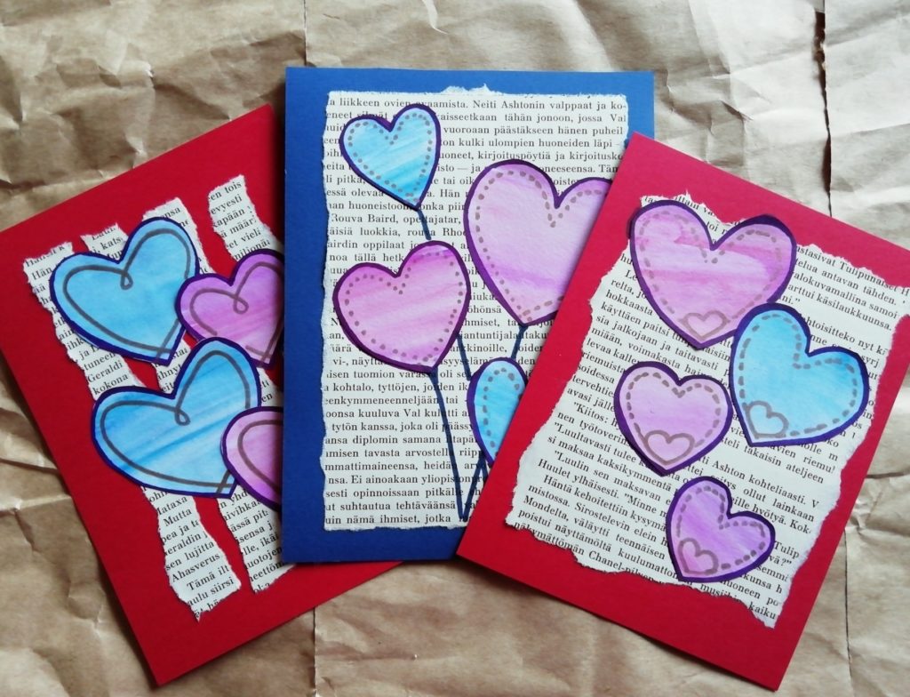 Leikkaa vesiväripaperista sopivan kokoisia sydämiä. Sommittele ja liimaa sydämet korttipohjaan. Anna kuivua hetki ja lisää tusseilla yksityiskohtia. Kirjoita taakse terveiset ja oma nimesi. Anna kortti ystävällesi, postitus kannattaa hoitaa tarvittaessa hyvissä ajoin.