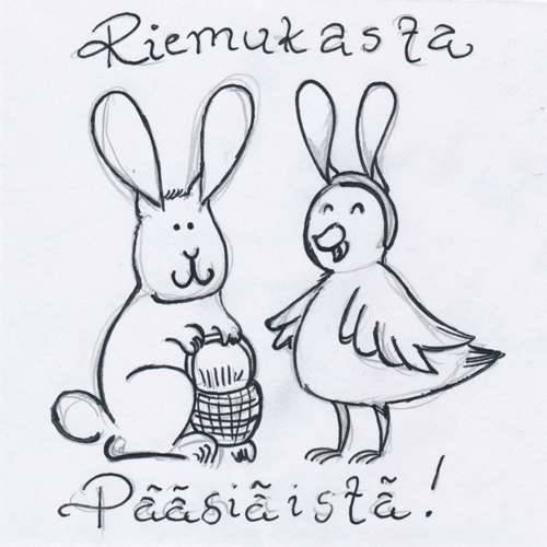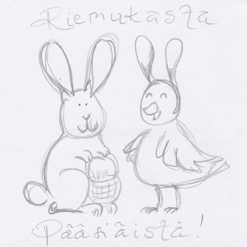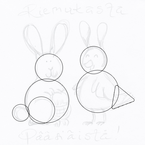 1. Etsi sopivan kokoinen paperi ja luonnostele siihen lyijykynällä kevyesti pääsiäisaiheinen piirros. Muista käyttää hyväksesi perusmuotoja, tämä helpottaa mittasuhteiden ja hahmojen koon piirtämistä.